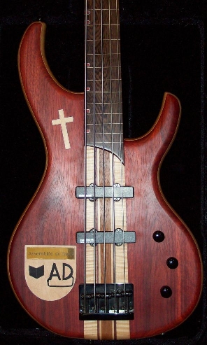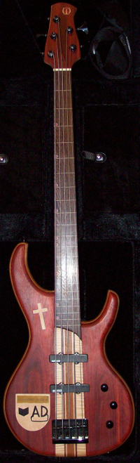 This bass was built in 2007 for a church in Anchorage, Alaska, which donated the guitar as a gift to a church in Burkina Faso, Africa. It is a fretless five string bass. The top is Bloodwood with a very thin maple laminate on top of a solid maple core. The neck consists of seven laminates of maple, purpleheart and mahogany. It has a wenge fretless fingerboard with fretlines of maple and position markers of bloodwood with a trim of white to accent them. The cross on the body is maple with a contrasting white outline. The emblem on the body is the logo of the Burkina church. It has jazz pickups with an active/passive setup and black hardware. As with all Miller basses, the logo is inlaid into the headstock.