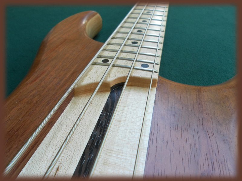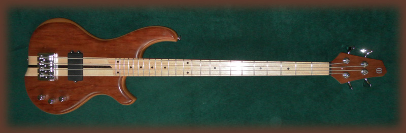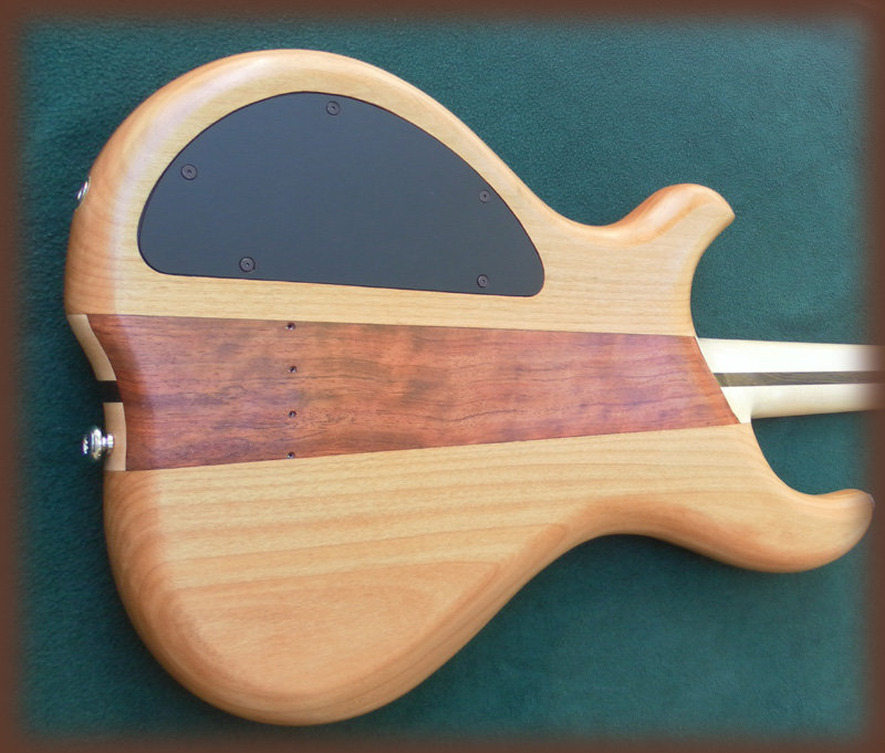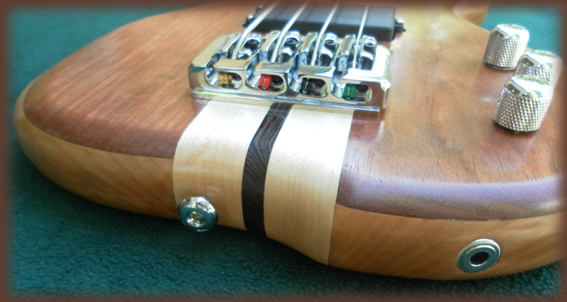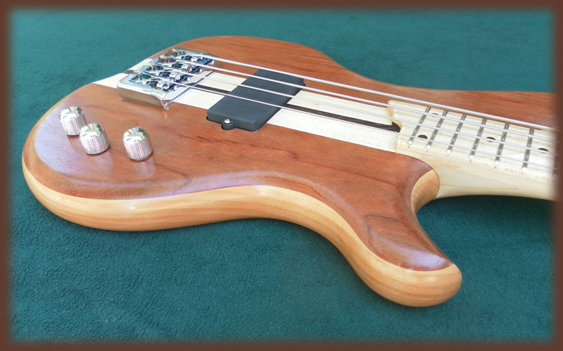 The body of the bass is Alder with a piece of bubinga covering the neck laminations. The neck is a three piece lamination of maple with wenge as the center laminate. The fingerboard is a very beautiful piece of birdseye maple with a lot of character.