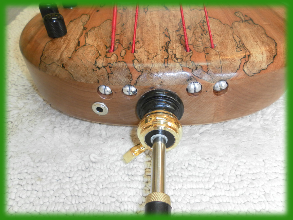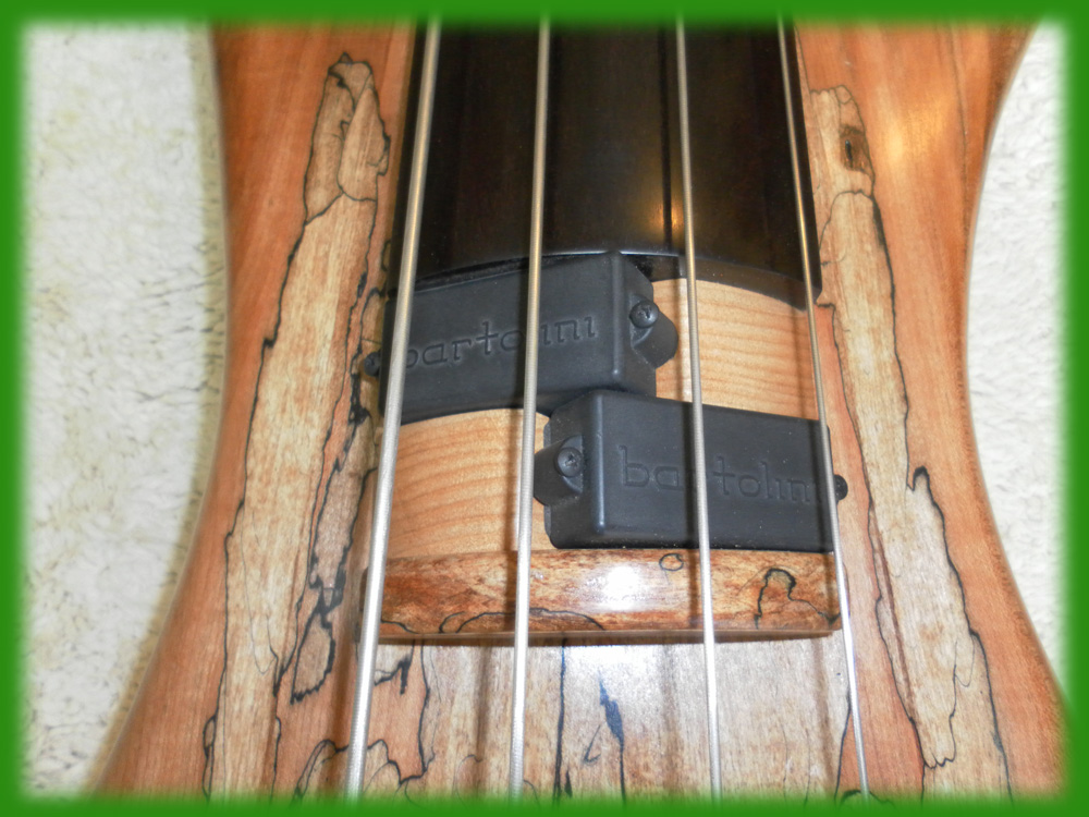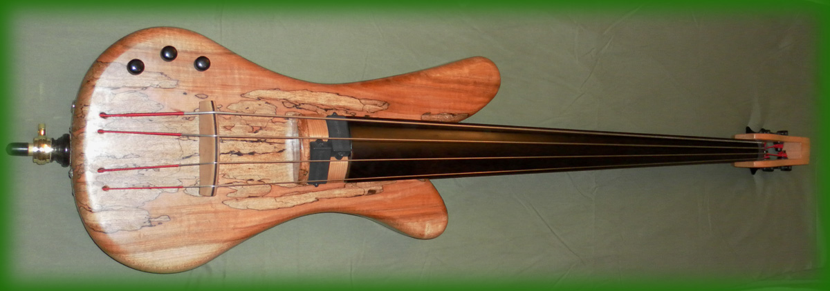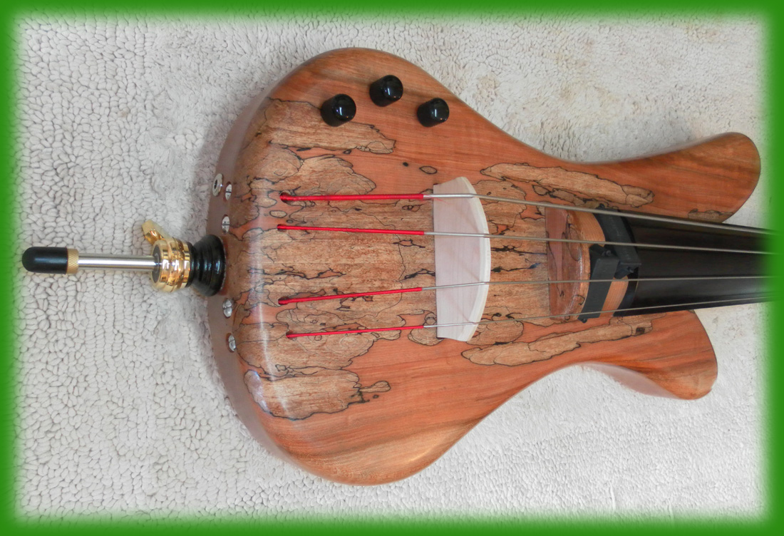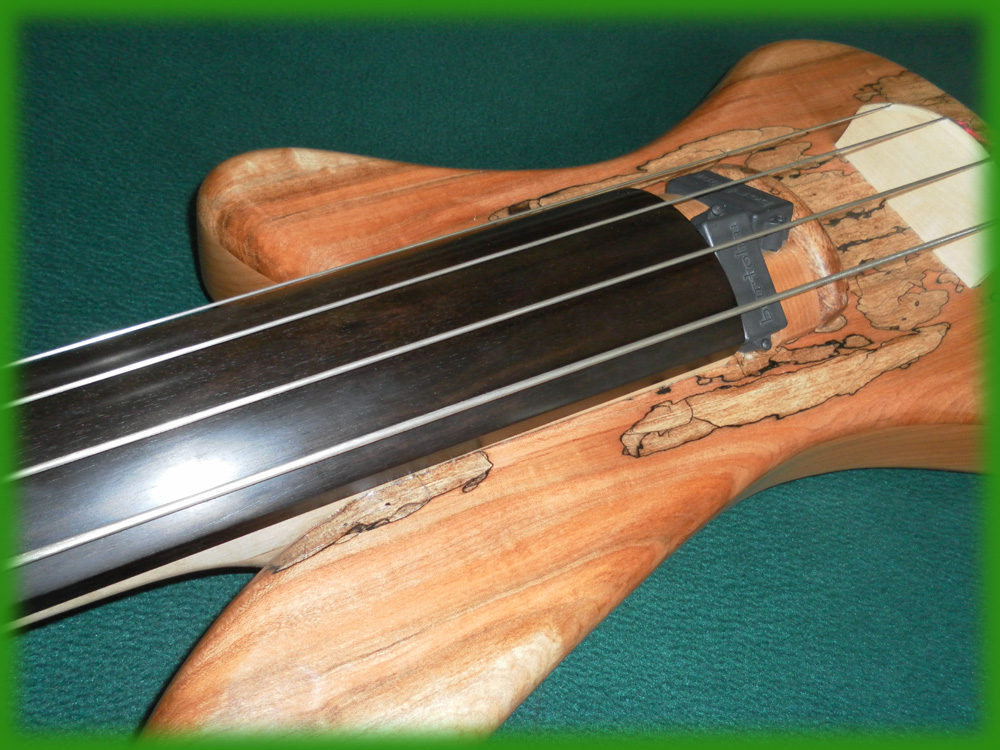 Spalted Thunder was an interesting project to say the least. Andrew came to me through a friend of mine I had built a bass for about a year prior. Andrew had specific design ideas in mind and we worked together to make sure that he was happy throughout the building process. Over the next few weeks and many design tweaks later, we finally were able to settle on a design we both thought would give the look and hopefully the sound he was trying to achieve. The sound that we were attaining to accomplish was an acoustic upright. The hours put into Spalted Thunder has proven to be very satisfactory, not only to the eyes but also to the ear. As it turns out, in the end, Andrew was very pleased with not only the looks but also the sound of the instrument. The acoustic sound we were trying for has proven itself in the end. The combination of many qualities has given this instrument a unique depth of character.