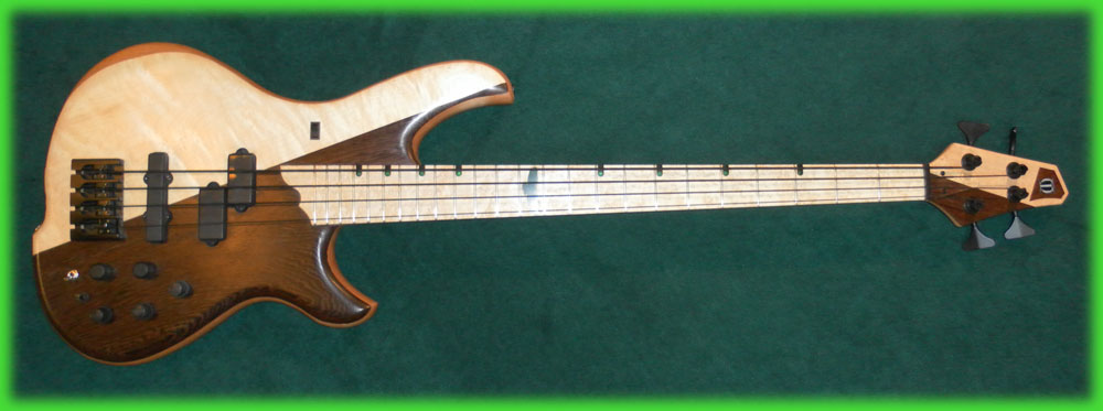This bass has a few unique features. First off is the green top/side LED position markers. They are set into the neck so that they are able to be seen from the front and side as can be seen in the pictures. At the 12th fret there is an eagle with Jeff's initials. There are LED's that light his initials also but they cannot be seen when the lights are off. The top and matching headstock are a combination of maple and wenge. The back is maple with a matching wood electronics cover. It is cut from the same piece as the back before it is glued to the core. This keeps the grain consistent throughout the entire back piece. The center part of the body is made of alder. The neck is made from maple and purpleheart laminations. The finish is tung oil.